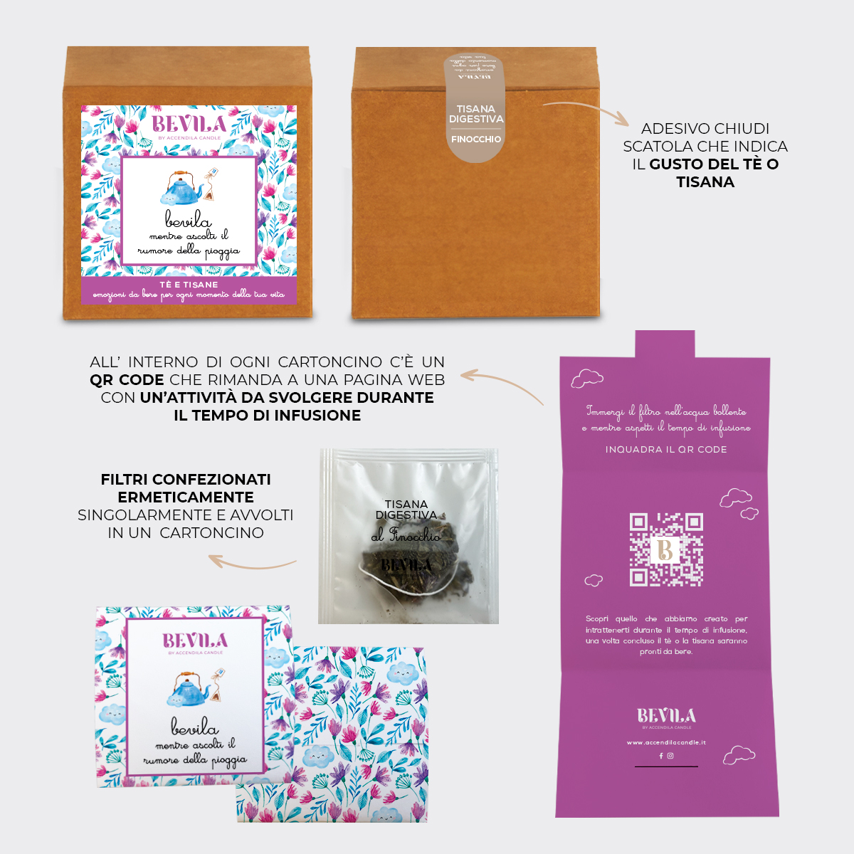 GUSTO: Tisana digestiva al Finocchio Silenzio, rumore della pioggia e tisana! Un mix perfetto, unico, diventa ancora più perfetto se nella tua tazza non c'è una tisana qualsiasi, ma se hai BEVILA! Un'azienda che ha studiato nei minimi dettagli la sua tisana, ogni confezione, imbustata singolarmente, permette di mantenere perfettamente il profumo e la qualità del prodotto. All'interno troverai 10 confezioni di tè, un sotto bicchiere, e delle attività da svolgere mentre attendi che il tuo infuso sia pronto. Perfetta da regalare o da regalarti!Spediamo entro 1/2 giorni dalla ricezione della email di conferma.